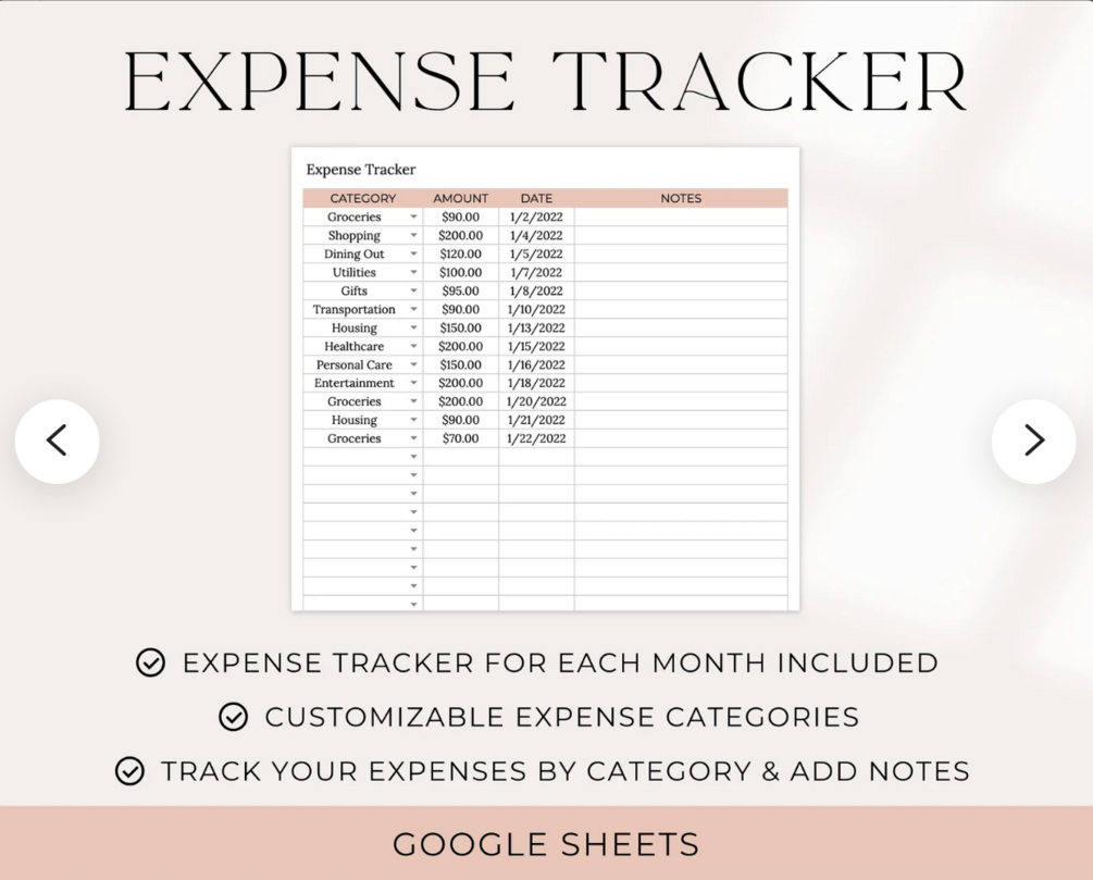 ✔︎ Each monthly budget tab includes an expense tracker to track your expenses by category (groceries, transportation, utilities, etc.)